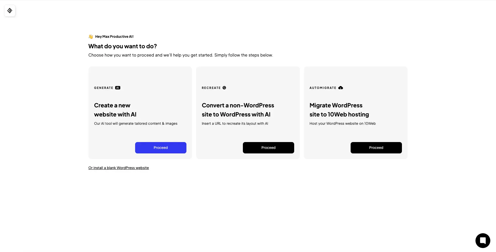 The 10Web dashboard presents a clean, straightforward interface with three main options: Generate a brand-new website using AI (the primary feature), Recreate a non-WordPress site by entering its URL, or Automigrate an existing WordPress site to 10Web's Google Cloud hosting. There's also an option to install a blank WordPress site if you prefer starting from scratch. The simplicity of this entry point makes it easy to get started within seconds.