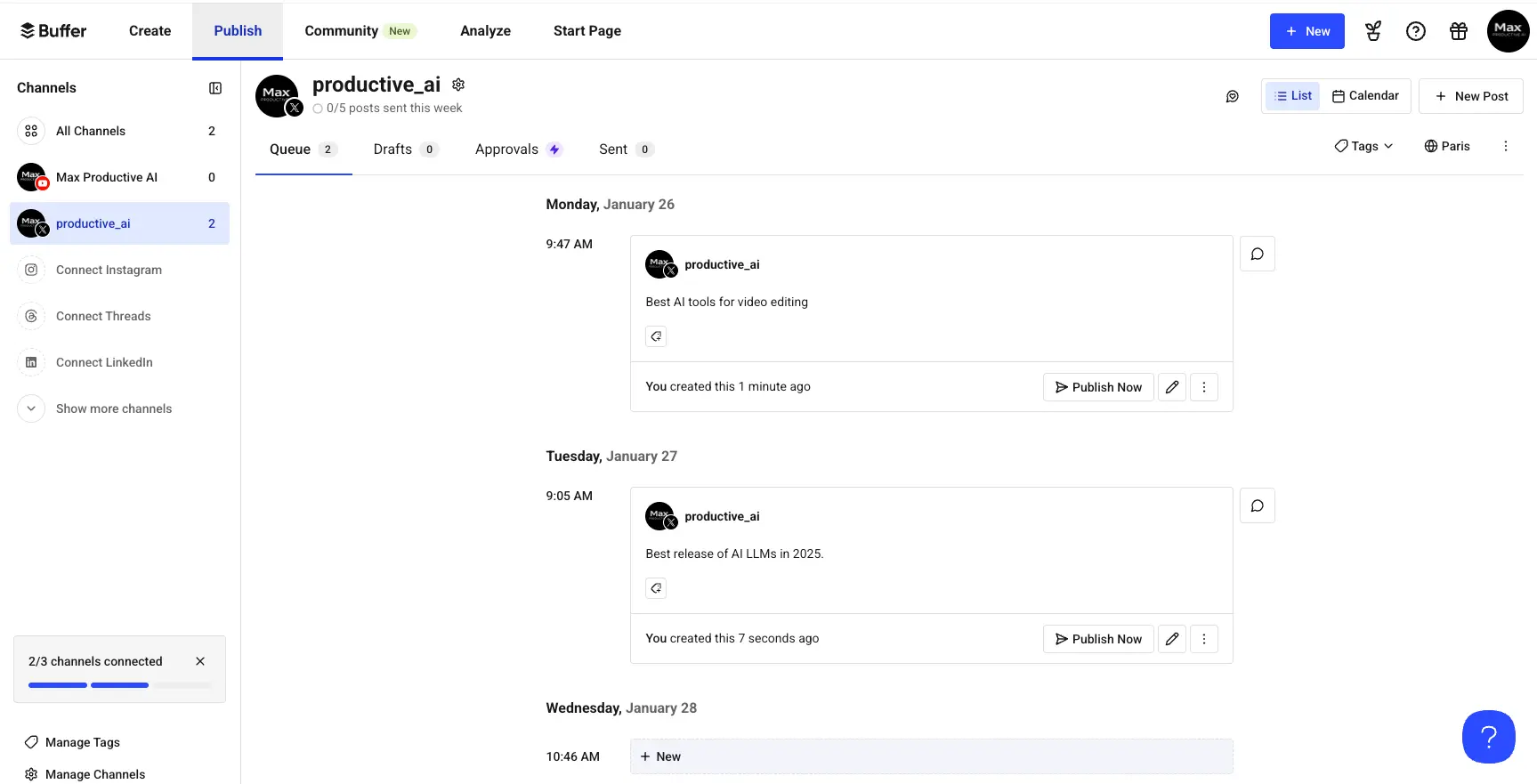 The Publish dashboard presents a clean, organized view of your content queue. Each post shows the scheduled date, time, and a preview of the content. The left sidebar lets you switch between channels (2/3 connected in this example), while the List/Calendar toggle in the top right allows you to visualize your schedule differently. Posts can be published immediately, edited, or rescheduled with simple one-click actions.