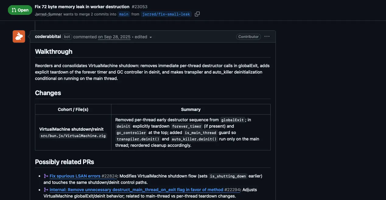 When a pull request is opened, CodeRabbit posts a structured review comment directly in the PR thread. The walkthrough section provides a concise, plain-English explanation of what changed and why. Below it, a changes table breaks down each modified file with a summary of what was done. The platform also identifies potentially related PRs—helping developers understand the broader context of any change.