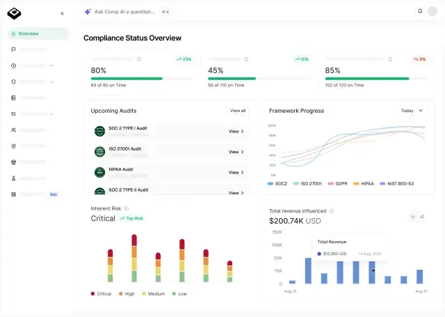 The Comp AI dashboard provides an immediate overview of your compliance posture across all active frameworks. The top section displays on-time completion rates — in this view, showing 80% for the first framework (60 of 80 controls on time), 45% for the second, and 85% for the third. The framework progress chart tracks SOC 2, ISO 27001, GDPR, HIPAA, and NIST 800-53 simultaneously. The upcoming audits panel lists pending reviews with quick-access links, while the inherent risk section visualizes risk distribution from Critical to Low. Notably, the bottom-right panel tracks total revenue influenced by compliance ($200.74K USD in this view) — a useful metric for demonstrating ROI to stakeholders.