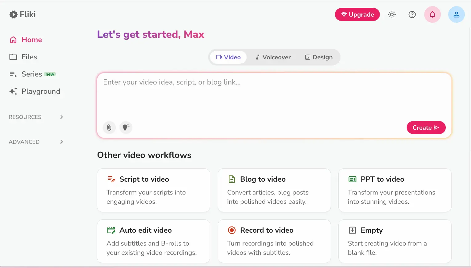 Clean interface. The main input field accepts a video idea, script, or blog link — type or paste, hit Create. Below that, six specialized workflow cards cover different starting points. The left sidebar gives quick access to Files, the new Series feature, and the Playground for experimentation. Straightforward enough that most people will be creating their first video within minutes of signing up.
