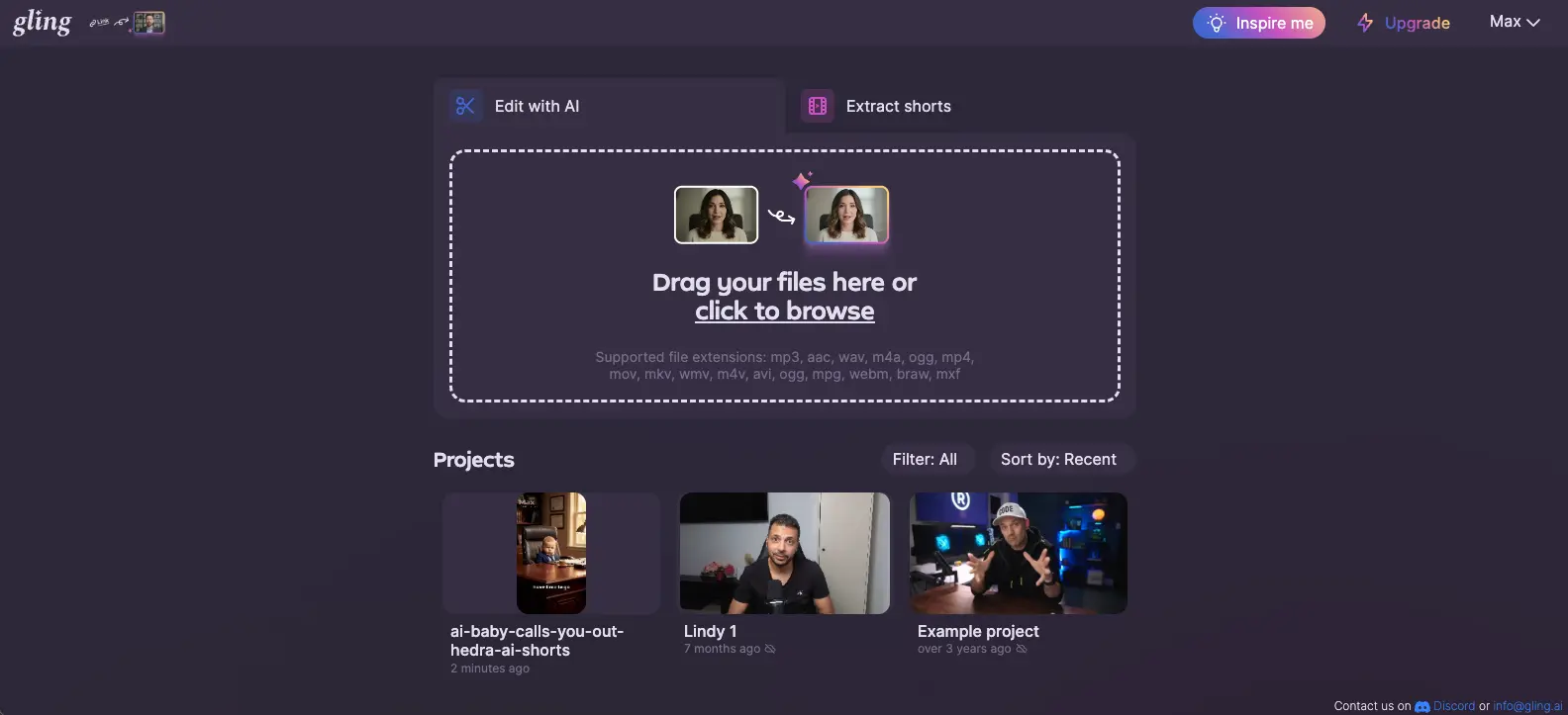 Gling AI dashboard showing drag-and-drop file upload area, Edit with AI and Extract shorts tabs, and recent projects