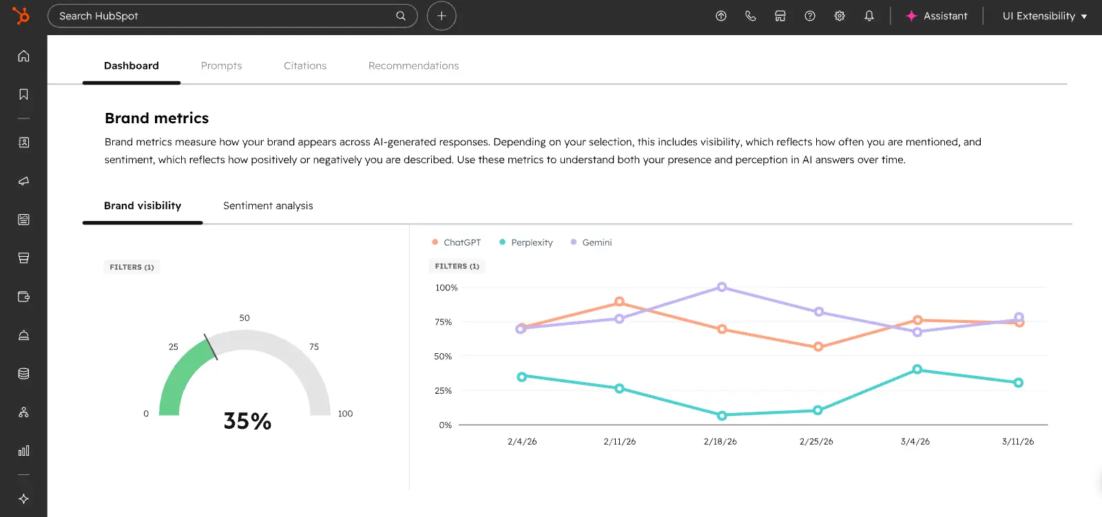 This isn't unique to HubSpot, but it matters: a visibility score based on poorly researched prompts is just a number around a dashboard. If your team doesn't have strong buyer persona research already, expect to spend meaningful time on prompt configuration before the scores become trustworthy. The CRM integration helps — but only if your CRM data is itself well-maintained.