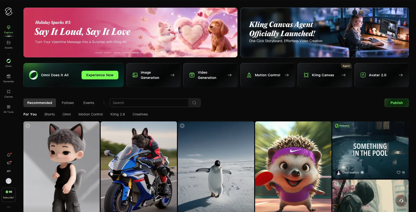 The dashboard is clean and well-organized. The top row gives direct access to each creation module—Image Generation, Video Generation, Motion Control, Kling Canvas, and Avatar 2.0. The "Omni" option is the unified multimodal entry point introduced with Kling O1. Below, a community feed shows featured creations filtered by type (Shorts, Omni, Motion Control, Kling 2.6, Creatives). The dark interface works well for visual content work.