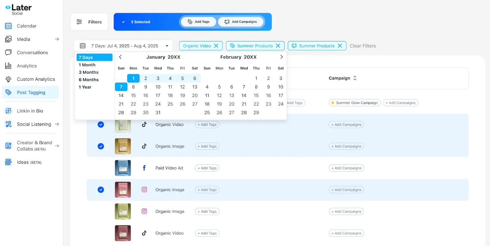 Later's visual calendar is the heart of the platform. The left sidebar provides quick access to Calendar, Media, Conversations, Analytics, and the AI-powered Ideas feature. The main calendar view shows all scheduled content across platforms with filter controls for date range (7 days, 1/3/6 months, or 1 year), content type (Organic Video, Organic Image, Paid Video Ad), and campaign tags. You can bulk-select posts to add tags or assign to campaigns—useful for organizing seasonal content or tracking performance by theme.