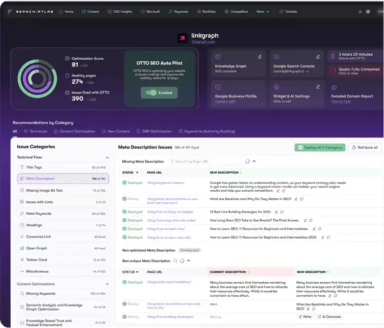 World's FirstOTTO SEO represents the industry's only autonomous AI assistant that deploys SEO fixes directly to websites through JavaScript pixel technology or WordPress plugin integration. The system automatically rewrites title tags, updates meta descriptions, adds schema markup, restructures internal links, and optimizes content without manual implementation. Users report 90% reduction in manual SEO work compared to recommendation-only tools like Semrush, Ahrefs, or Moz Pro.